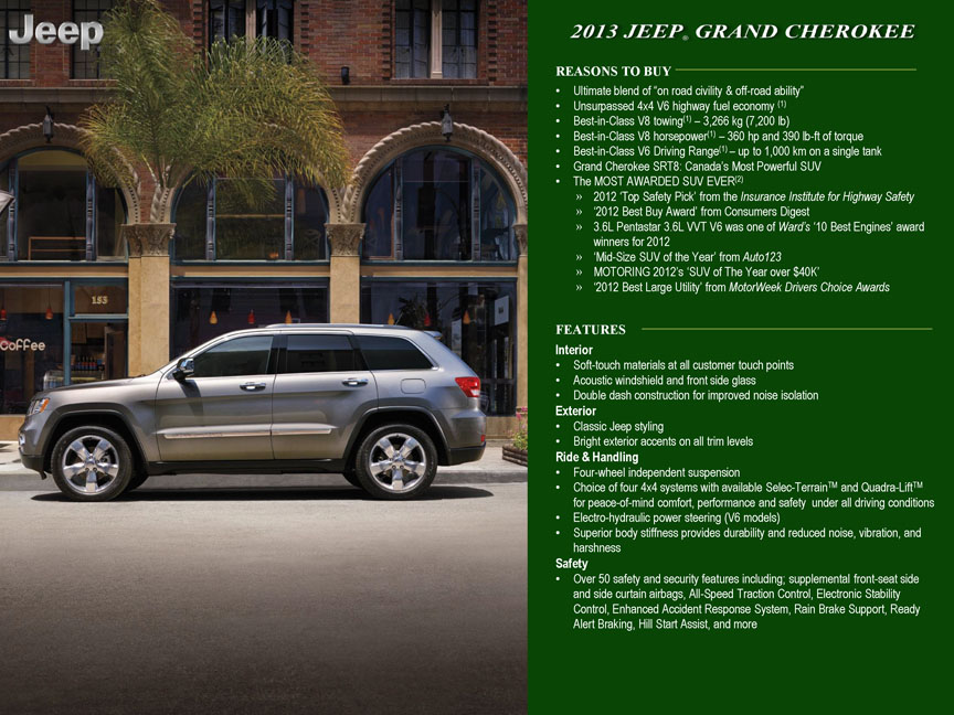 Canada - 2013 Grand Cherokee sales flyer. 2-pages. Issued July 2012. PDF (786 KB)