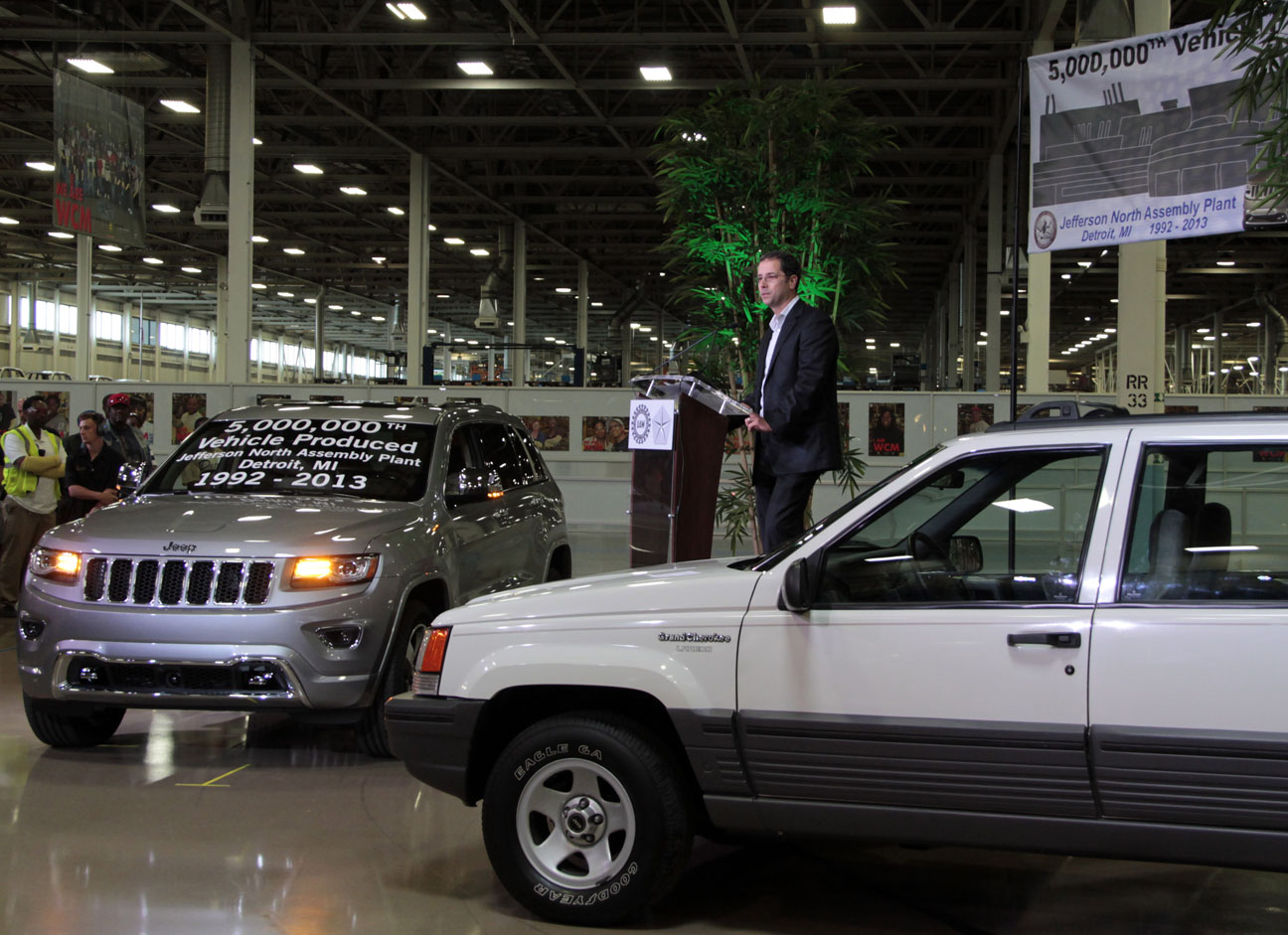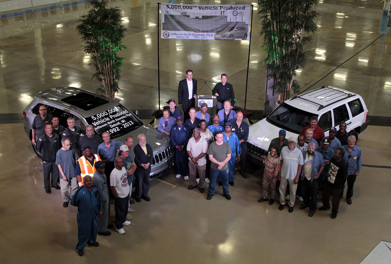 August 13, 2013, DETROIT - Five million and counting. Located in the heart of Detroit, Chrysler Group's Jefferson North Assembly Plant (JNAP) has been pumping out vehicles since 1992 and today it celebrated a significant milestone - the five millionth vehicle to roll off the assembly line. The Billet Silver 2014 Jeep® Grand Cherokee Overland, with Chrysler Group's Senior Vice President of Manufacturing Scott Garberding behind the wheel and UAW Assistant Director Virdell King riding shot gun, made its debut during a celebration at the plant before finding a permanent home with the United Service Organizations (USO). To mark the occasion, 50 JNAP employees who have 30 or more years of service and most likely touched nearly every one of those five million vehicles, as well as the plant's Veterans Committee were in attendance. "Twenty-one years ago, the first Jeep Grand Cherokee rolled off this assembly line and while it was questionable whether we would ever make it to this point, the people in this plant never lost their focus," said Garberding. "Certainly many things have changed over the years, but one thing has remained constant - the dedication and commitment of this workforce." "I had the privilege of being plant manager here in 2000, working alongside this very skilled workforce. Now as the head of manufacturing, I continue to be impressed by the commitment that is demonstrated here every day. As sales of the Grand Cherokee continue to increase to record levels, we are asking our employees to do more and they have responded by rising to the challenge. They are the heart and soul of this plant and this company, and have been entrusted to build a vehicle that is critical to the continued success of Chrysler Group," said Garberding. To keep up with the increasing demand, 1,100 new employees were added at the three-million-square-foot facility in October 2012 to implement an alternative work pattern, running three crews, working two 10 hour shifts, six days a week. The plant currently employs nearly 4,500. In 2012, the plant produced 291,403 vehicles. "This plant and this workforce are shining examples of what can be achieved when there is a common goal and a united spirit," said the UAW's King. "Together, management and labor have persevered to implement a culture change that has allowed us to reach this significant milestone. We look forward to producing the next five million vehicles and building on the legacy that has been established at this plant with the support of the next generation of autoworkers."