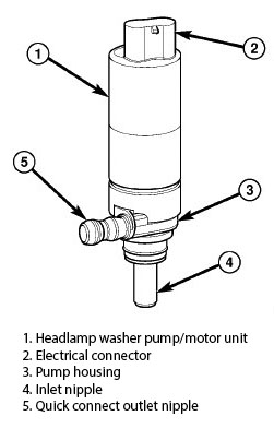 - Headlamp Washer Pump/Motor - The electric headlamp washer pump/motor unit is located in a dedicated hole on the lower, outboard side of the washer reservoir, ahead of the left front wheel house splash shield. This high pressure pump is located above and rearward of the reversible front and rear washer pump/motor unit on the reservoir.