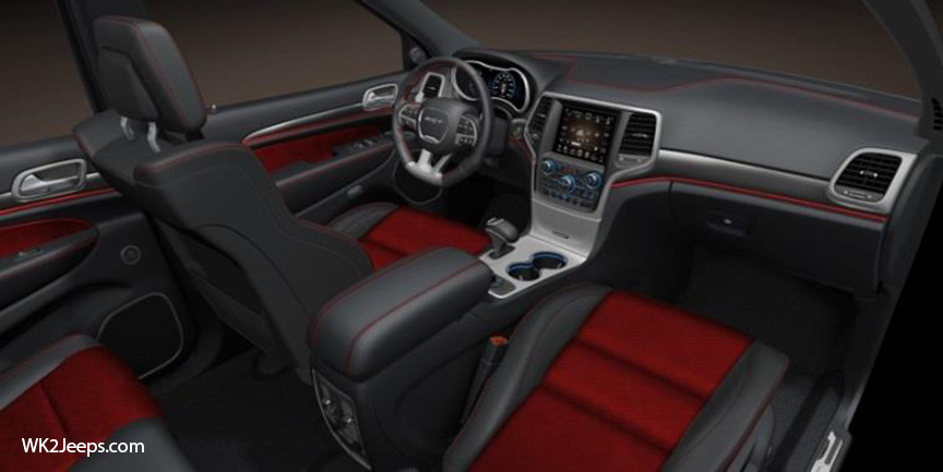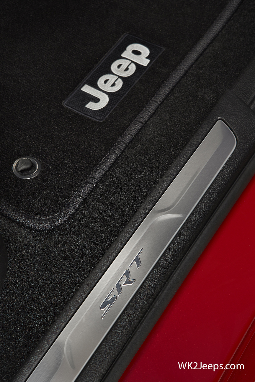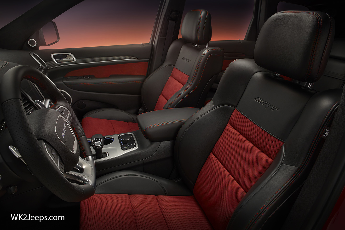 On the exterior, standard five-spoke 20-inch "Goliath" wheels are finished in Black Chrome with bright chrome center caps, while additional gloss black appointments include the SRT liftgate badge, Jeep hood and rear light bar badges, Grand Cherokee door badge, lower grille bezels and upper grille inserts.