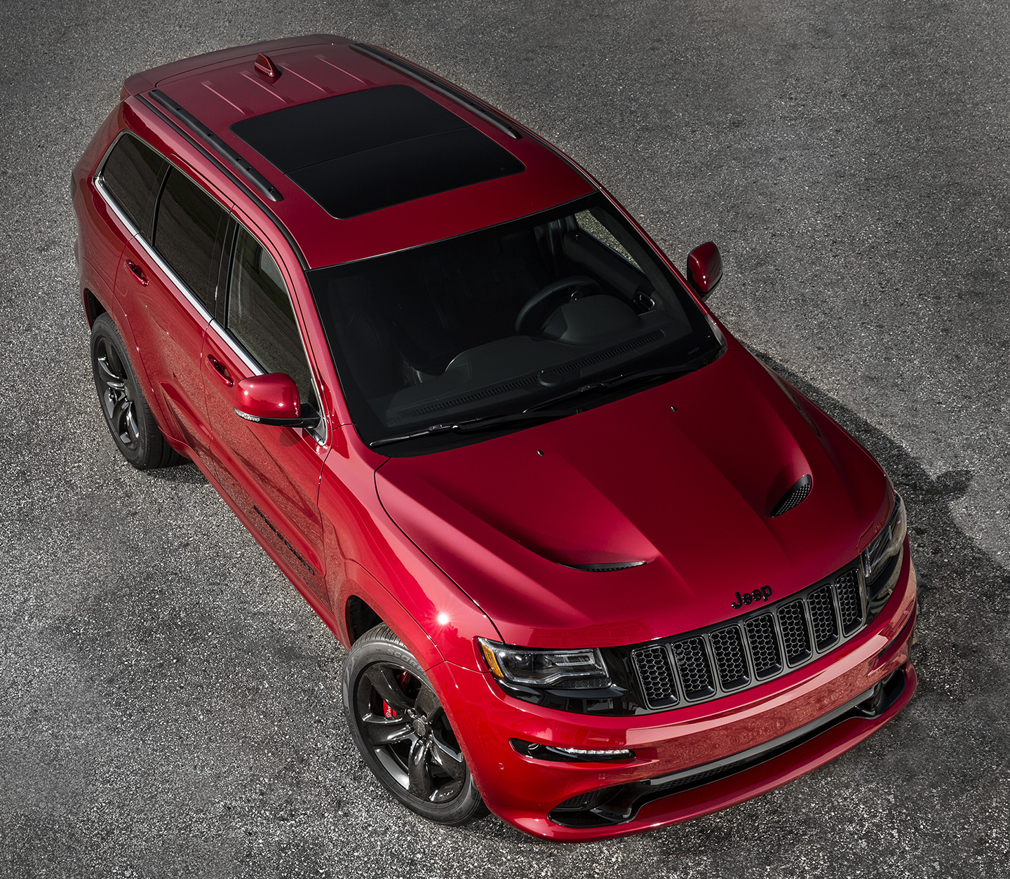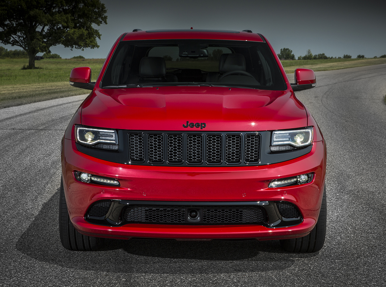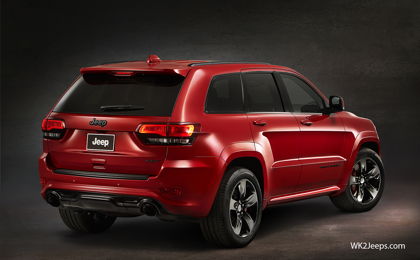 On the exterior, standard five-spoke 20-inch "Goliath" wheels are finished in Black Chrome with bright chrome center caps, while additional gloss black appointments include the SRT liftgate badge, Jeep hood and rear light bar badges, Grand Cherokee door badge, lower grille bezels and upper grille inserts.