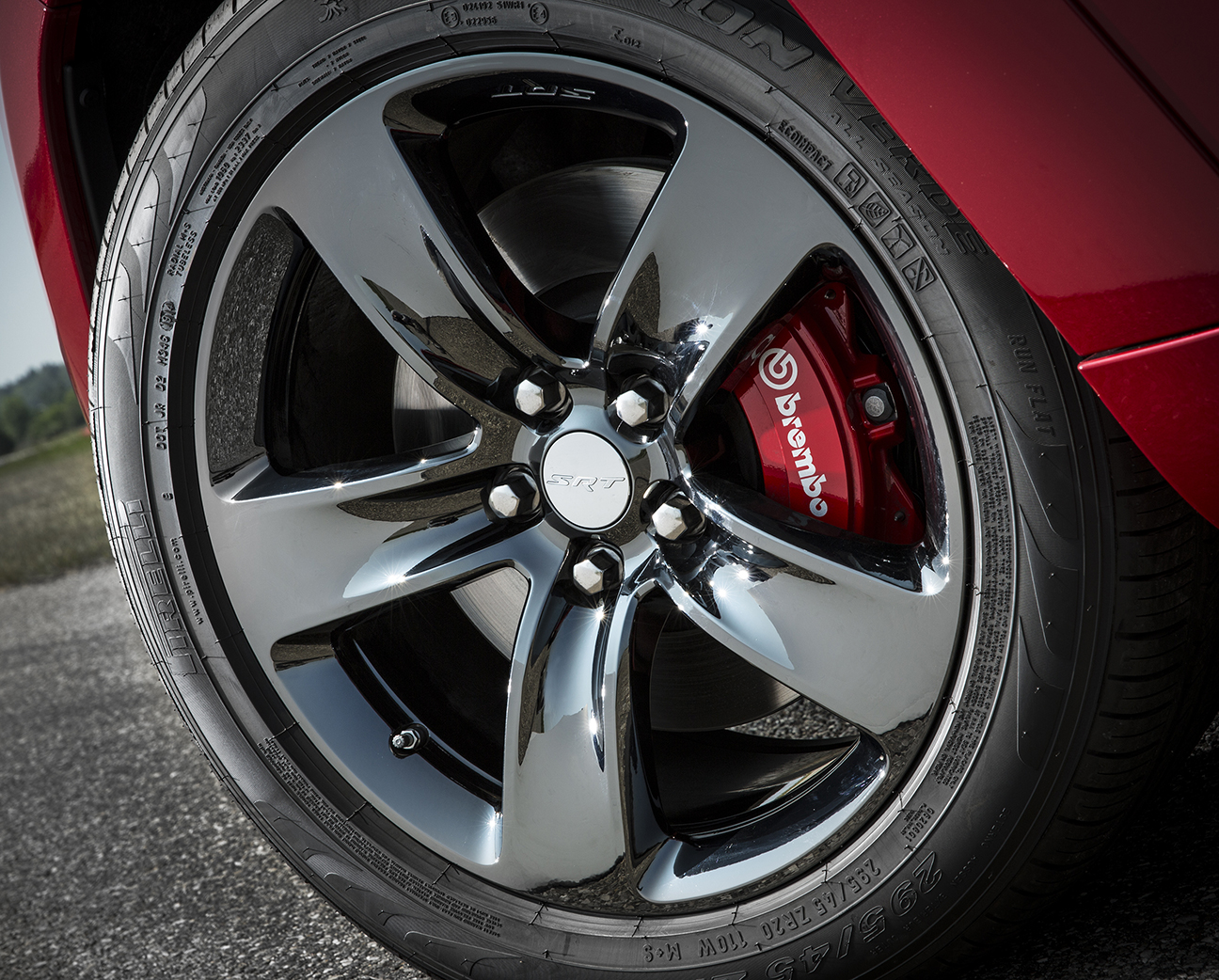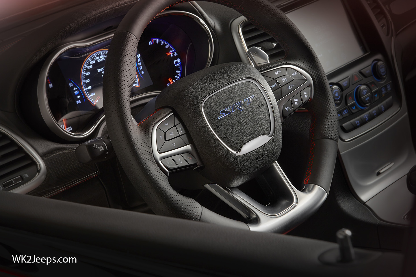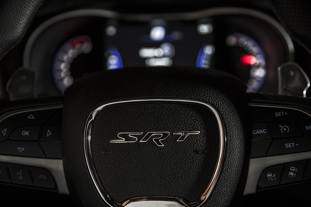 Inside, the exclusive SRT logo on the high-performance designed steering wheel is backlit and the steering wheel bezel changes to an anodized silver finish. Light black chrome replaces the standard bright chrome and Radar Red accents are used throughout the cabin to enhance the luxurious, muscular interior.