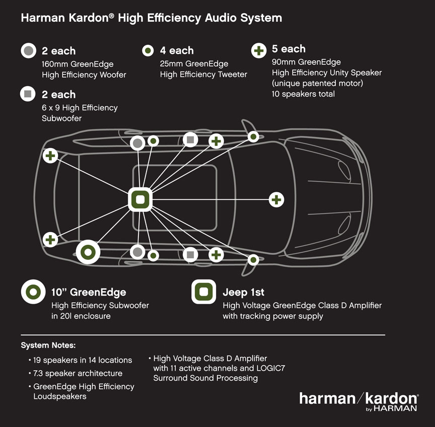 New 7.3, 825-watt Harman Kardon Surround Sound audio system with Logic 7 technology is an exclusive feature of both the top-of-the-range Summit model (Standard on 2014+ model years) and the high-performance SRT model (Optional on 2012+ model years). In European markets, the system is Standard on both the Summit and SRT. The system delivers maximum audio performance, innovative technology and engineering excellence. Logic 7 Surround Sound processing delivers authentic, multidimensional listening pleasure throughout the new Jeep Grand Cherokee.