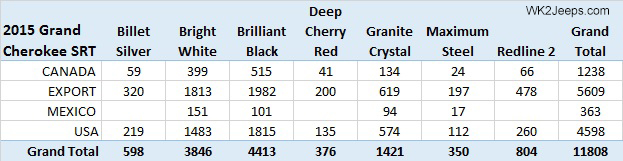 About the production numbers Presented here is our exclusive list of the production totals for the 2015 Grand Cherokee SRT8, broken down by country, state and province. Production of the 2015 model year Grand Cherokee SRT8's started on July 21, 2014 and ended on December 23rd, 2015. |