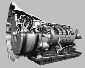A broad ratio spread from First to the Fifth was selected to minimize fuel consumption and reduce powertrain noise during cruising. An aggressive First-gear ratio provides excellent launch performance, and evenly spaced gear ratios provide smooth acceleration through the gears. World-class efficiency is achieved through physical and electronic means. This transmission uses bearings to reduce friction in many locations where other transmissions may utilize bushings. The transmission also uses a unique scavenging system that removes oil spun off of the rotating parts by centrifugal force through strategically placed slots in the outside of the case. This saves energy that would be consumed by internal parts rotating in oil. Lubricating holes in the clutches are also positioned to promote quick passage of the transmission fluid through the discs, minimizing viscous losses due to trapped oil. The shift schedule adapts to individual driving style, driving situation and road conditions, altering shift points based on an accelerator pedal usage, brake usage, lateral acceleration, altitude and load on the car as a result of grades. Electronically controlled engine torque management provides quick wide-open-throttle up shifts and quick two-step (4-2 or 3-1) kick-down shifts that are exceptionally smooth. Transmission ratios: